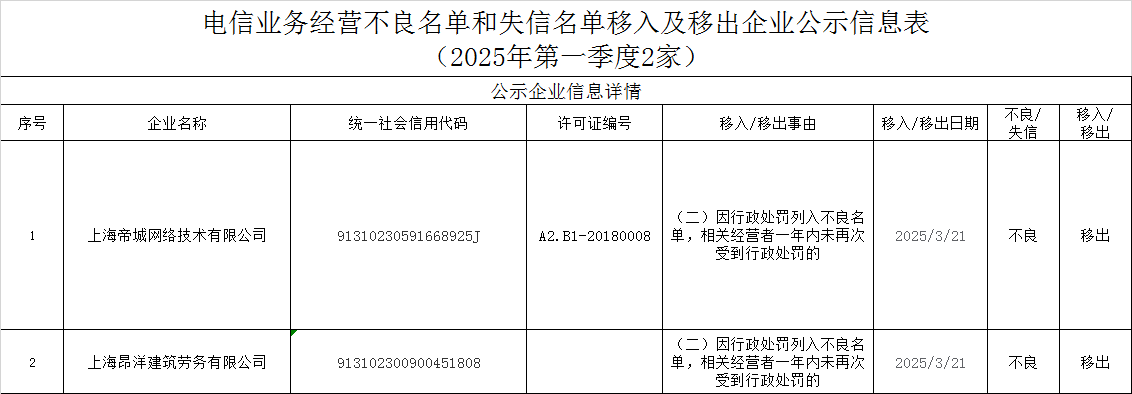 电信业务经营不良名单和失信名单移入及移出企业公示信息表(2025年第一季度2家)