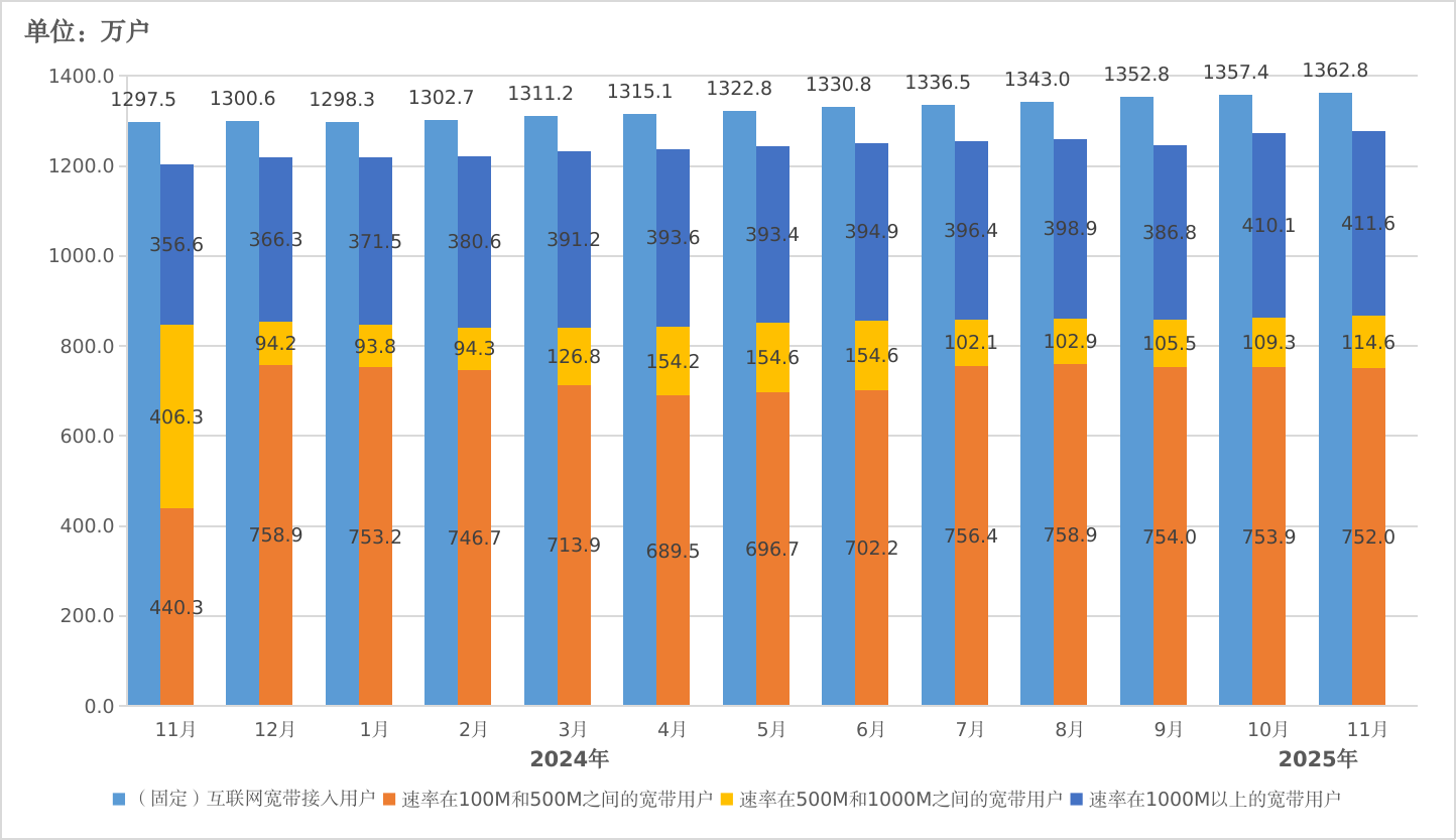 固定宽带接入用户增速稳定,千兆用户数稳定提升。截至11月末,各基础电信企业固定互联网宽带接入用户总数达1362.8万户,同比增长5.0%,较上年末净增62.2万户。其中,光纤接入(FTTH/O)用户1306.6万户,占固定互联网宽带接入用户总数的95.9%;100Mbps及以上接入速率的固定互联网宽带接入用户达1278.2万户,占总用户数的比重为93.8%;500Mbps及以上接入速率的固定互联网宽带用户达526.2万户,占总用户数的比重为38.6%;1000Mbps及以上接入速率的固定互联网宽带接入用户为411.6万户,占总用户数的比重为30.2%;2000Mbps及以上接入速率的固定互联网宽带接入用户为27.0万户。